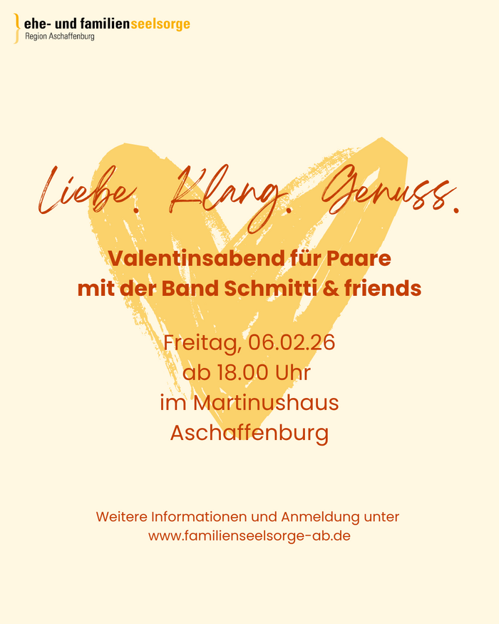 Zum Valentinstag bieten wir Euch als Paar in einem gemütlichen Ambiente Musik, Impulse und Snacks an. Musikalisch wird der Abend von der Band „Schmitti & friends“ gestaltet. Kulinarisch werdet Ihr vom Team von Eventcatering Hoefel verwöhnt. Während des Abends gibt es immer wieder kleine Gedankenanstöße und die Möglichkeit für euch als Paar, ins Gespräch zu kommen.