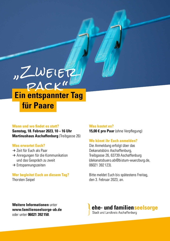 Zweierpack“ ist eine neues Angebot für Paare. Gemeinsame Zeiten als Paar, Anregungen für das Gespräch zu zweit und Entspannungszeiten - darum wird es an diesem Tag gehen. Der „Zweierpack“ wird von Thorsten Seipel gestaltet und begleitet.