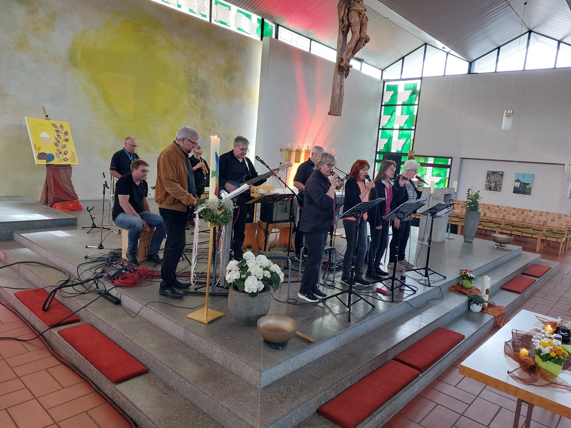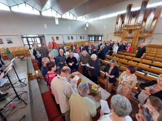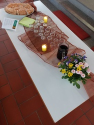 Mömbris-Schimborn. Über 70 Menschen aus dem Kahlgrund kamen zum letzten besonderen Abendgottesdienst "Zeit für uns" in die neue Kirche nach Schimborn. Das Team lud ein Erfahrungen von Gemeinschaft zu benennen und mit der Nachbarin, dem Nachbar eigene Erinnerungen des Gemeinschaftsfestes "Erstkommunion" auszutauschen. Pastoralreferent Walter Lang erinnerte an das Grundzeichen der Wandlung, das Jesus seinen Jüngerinnen und Jüngern aufgetragen hat: ein Brot, das mindestens 5 mal sich wandelt bevor es zur Energie im eigenen Körper verwandelt wird. Danach waren alle zu einer Agapfeier, dem Teilen Brot und Traubensaft an Tischen, eingeladen. Die Band "WTL" (Way Thruth and Life) aus Schimborn brachte mit ihren Liedern und ihrer Musik die richtige Stimmung zu diesem außergewöhnlichen Abendgottesdienst. Die nächste "Zeit für uns startet am Sonntag, 12.5., um 18 Uhr in der Kirche in Alzenau-Michelbach.