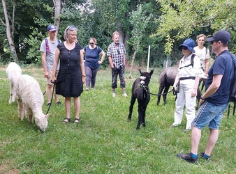 Alzenau. Sieben wagemutige Paare aus Stadt und Landkreis Aschaffenburg machten sich mit den der Ehe- und Familienseelsorgern Thorsten Seipel und Walter Lang für einen Nachmittag auf den Weg mit den Hahnenkamm-Alpakas. Teresa Stolzenberger von den Hahnenkamm-Alpakas gab zuerst eine Einführung zu den männlichen Tieren und ihrem Verhalten. Die Begegnung mit einem Alpaka ist eine Faszination. Alpakas sind ruhige, neugierige aber auch scheue Tiere. Optisch laden sie zum kuscheln ein – dennoch kommt man so nah oft gar nicht an sie heran.