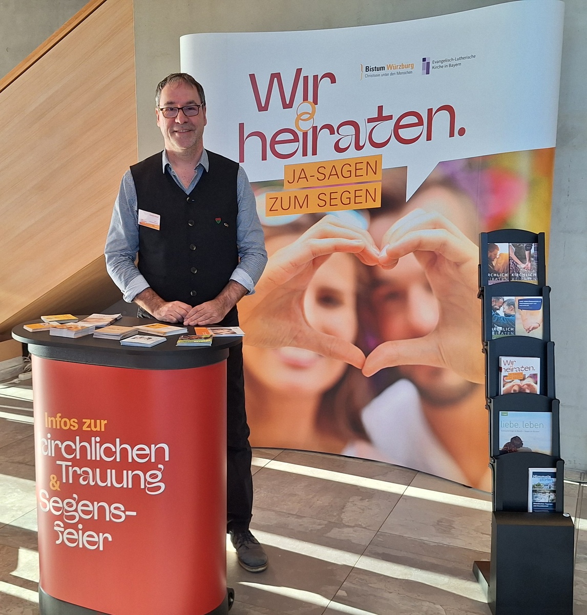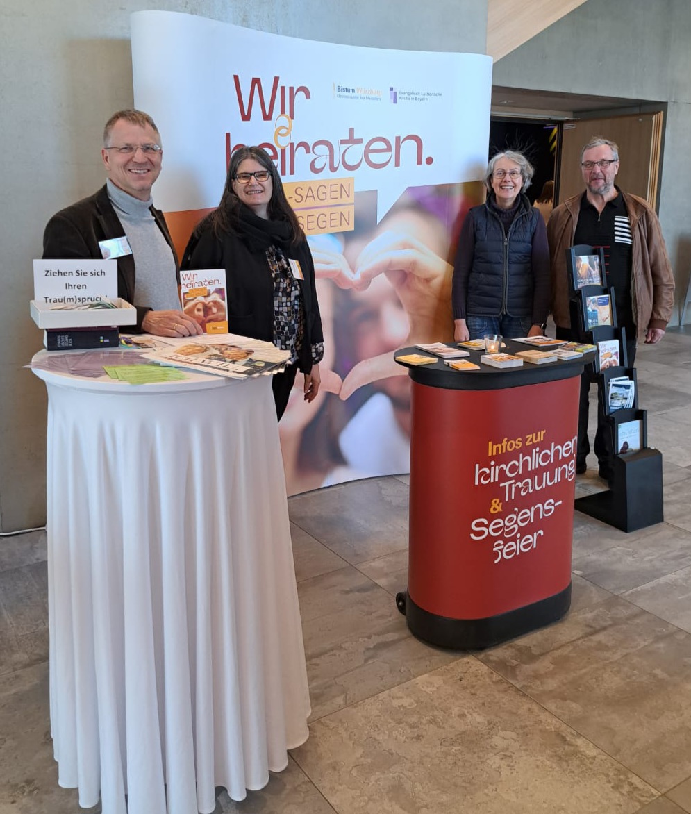 Der neu konzipierte Hochzeitsmessestand hat den über viele Jahre altgedienten abgelöst. In modernem Design als praktisch aufstellbare Wand und einem vorgelagerten Tisch als Ablagemöglichkeit für kleine Flyer ist der Stand kompakter und praktikabler geworden als der vorherige. Sowohl in Schweinfurt auf der Maininsel als auch in Bad Neustadt in der dortigen Stadthalle waren Seelsorgerinnen und Seelsorger der evangelischen und katholischen Kirche vertreten, um Paare bei der Gestaltung ihrer Feier zu beraten und über vielfältige Angebote zu informieren. Dabei legen wir als Seelsorgende Wert auf professionelle Angebote wie gut gestaltete sakramentale Trauungen bzw. Segensfeiern. Dies gilt im besonderen auch für die sakramentale Form der Eheschließung. Die Präsenz von Seelsorgerinnen und Seelsorgern beim ökumenischen Hochzeitsmessestand ist eine Chance, dass wir als Kirchen trotz weniger Ressourcen klar sichtbar bleiben in einer Gesellschaft, die immer vielfältiger wird. Ein Dank gilt von meiner Seite allen, die am Stand ihre Zeit und Möglichkeiten eingebracht haben.