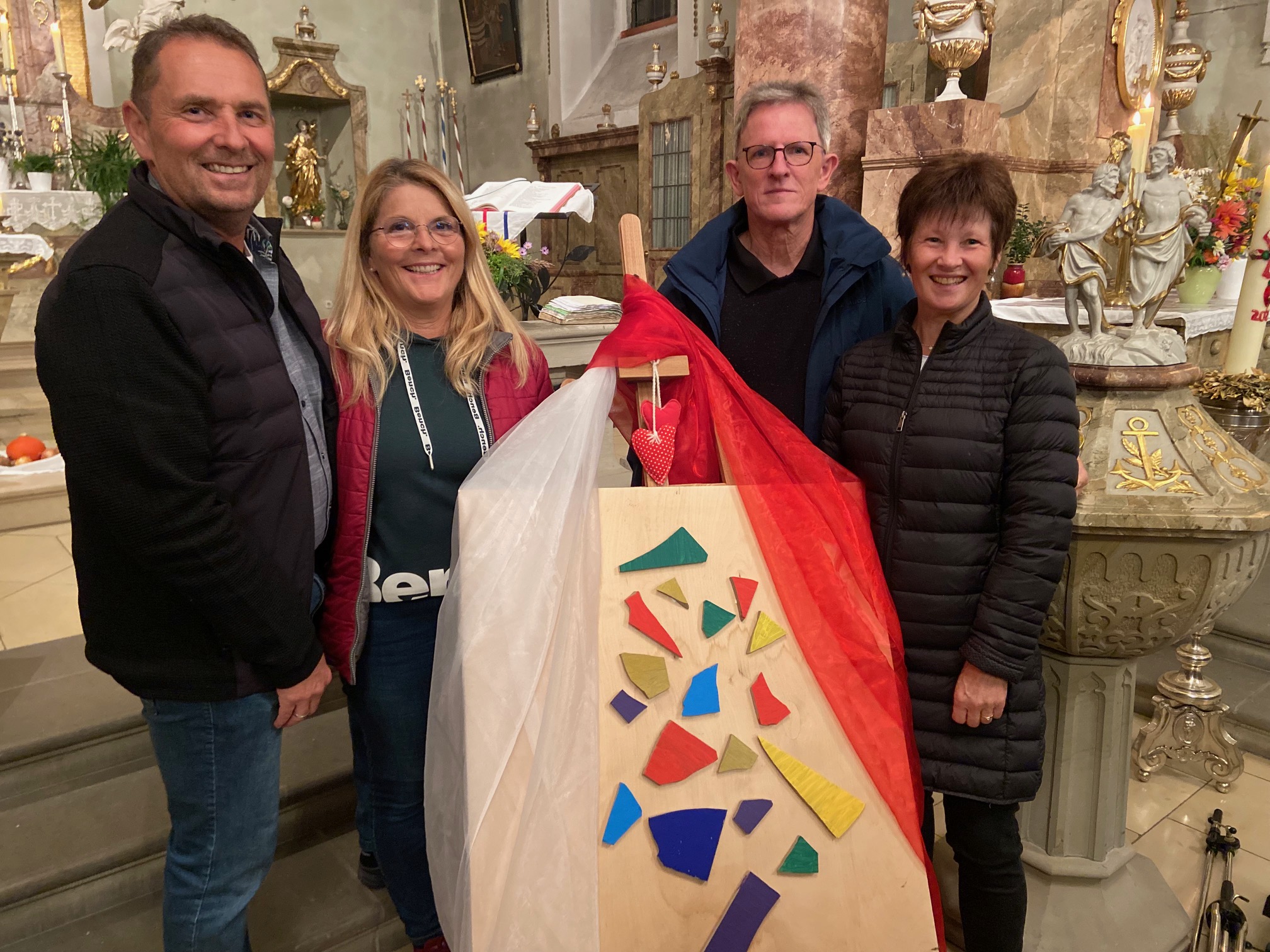 Zu einer besonders gestalteten Segensfeier hatten die Seelsorger:innen des pastoralen Raums Gerolzhofen in Zusammenarbeit mit der Ehe- und Familienseelsorge Schweinfurt alle Ehepaare eingeladen, die 20, 30 oder 40 Jahre (oder ähnlich lang) verheiratet sind. Etwa 30 Paare sind dieser Einladung gefolgt und konnten einen stimmungsvollen Gottesdienst in der Donnersdorfer Pfarrkirche erleben. Das Thema lautete "Mosaik unserer Liebe" und wurde von Gemeindereferentin Birgit Kestler und Pastoralreferent Josef Pohli durch ansprechende Texte und Symbole entfaltet. In einem Paargespräch tauschten sich die teilnehmenden Eheleute über die Farben Ihres "Lebensund Ehe-Mosaiks" aus, etwa über das Rot der Leidenschaft, das Gelb der Lebensfreude, das Blau des Glaubens, das Violett der Versöhnung oder das wertvolle Gold ihrer Beziehung. Die einfühlsame musikalische Gestaltung durch die Kirchenband Sulzheim bildete den stimmungsvollen Rahmen dieses besonderen Gottesdienstes, an dessen Ende sich die Paare gerne für ihren weiteren gemeinsamen Weg segnen ließen. Auch die Einladung zur anschließenden Begegnung und Austausch bei Federweißem und Gebäck wurde dankbar angenommen.