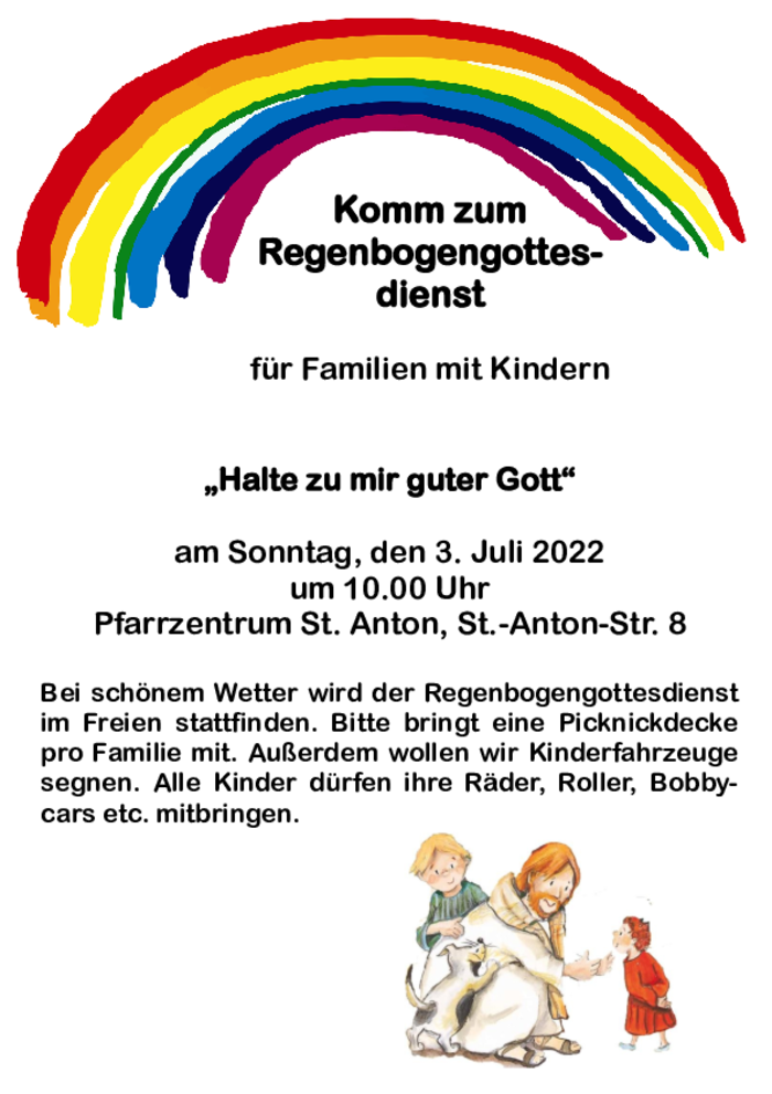 Bei schönem Wetter wird der erste Gottesdienst am 3. Juli 2022 im Freien stattfinden. Alle Familien werden gebeten, eine Picknickdecke mitzubringen. Außerdem sind alle Kinder eingeladen, ihre Fahrzeuge (Räder, Roller, Bobycars etc.) mitzubringen. Wir wollen diese Fahrzeuge im Gottesdienst segnen.