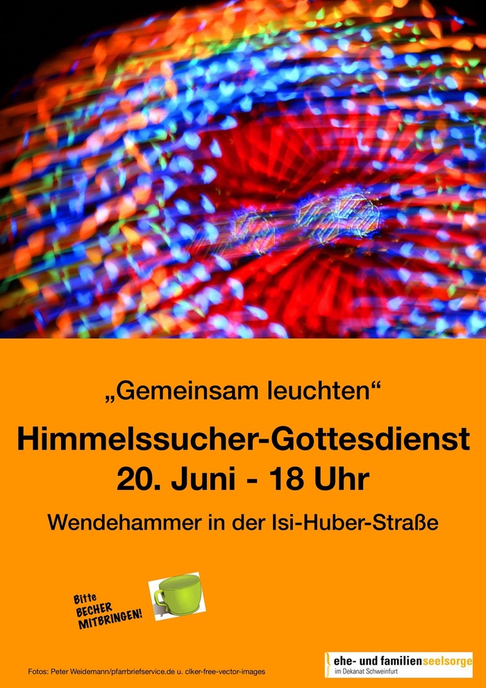 In Anlehnung an das traditionelle Johannis-Feuer lädt die Ehe- und Familienseelsorge Schweinfurt zum Gottesdienst mit dem Thema: „Gemeinsam leuchten“ ein. Dieser findet statt am 20. Juni 2026 um 18 Uhr am Wendehammer der Isi-Huber-Straße. Alle Nachbarn, aber auch andere Interessierte sind dazu herzlich eingeladen. Bitte dazu ein Trinkgefäß mitbringen, da wir zum Abschluss noch ein bisschen zusammensitzen wollen.
