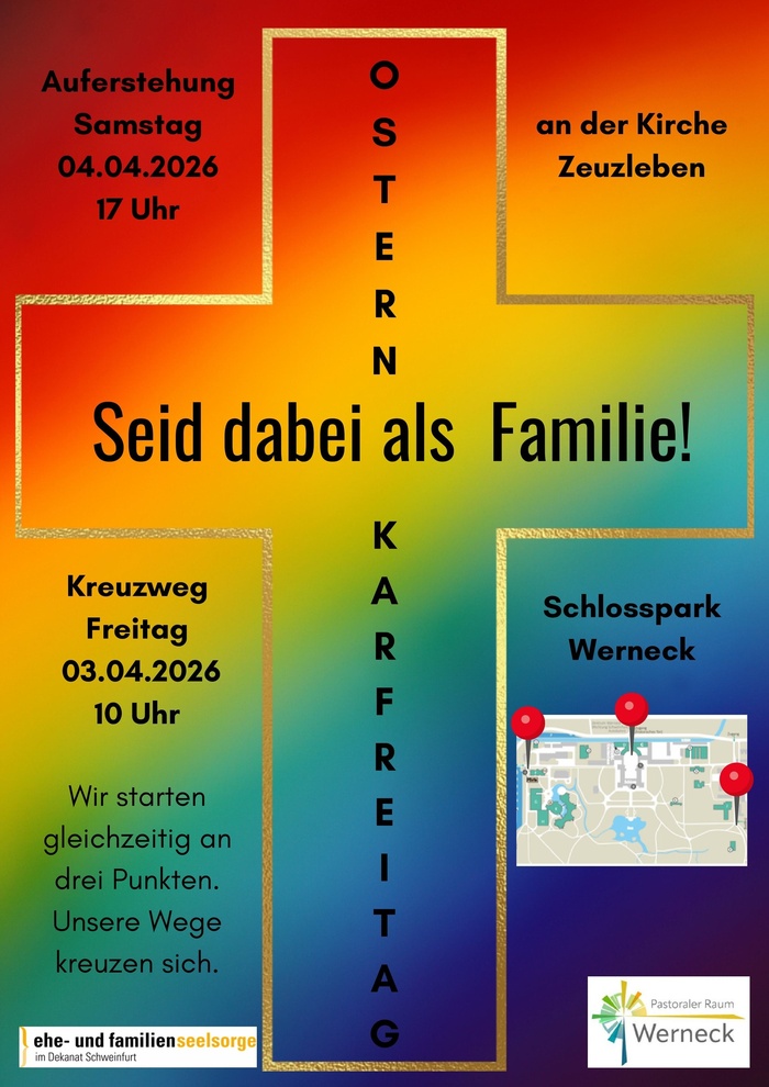 Im Schlosspark Werneck starten an den drei Eingängen jeweils Gruppen mit einem Kreuz (von Kindern und Familien gestaltete Kreuz-Stücke). In einem Zug, begleitet von Trommelmusik, gehen diese aufeinander zu und treffen sich an einem Punkt (am "Theater"). Dort trifft die "Not der Welt" (gestaltet auf dem Längsbalken) auf das, was Jesus auf seinem Kreuzweg erlebt hat.