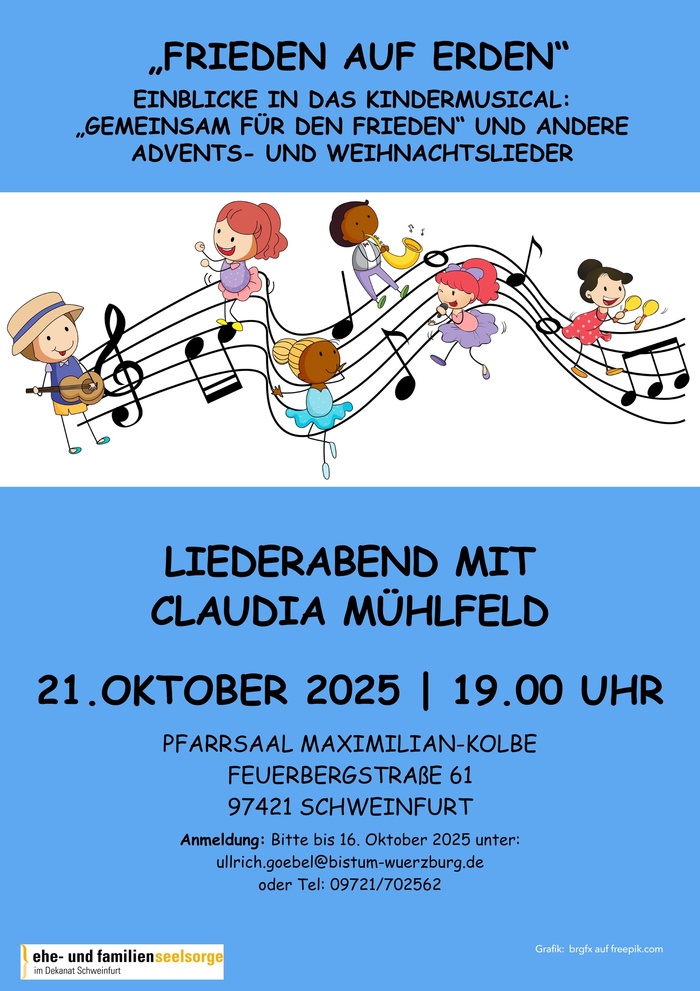 Die Ehe- und Familienseelsorge Schweinfurt bietet einen Liederabend für Ehrenamtliche in der Kinder- und Familienliturgie und weitere Interessierte an. Die Liedermacherin Claudia Mühlfeld stellt dabei schwerpunktmäßig Songs aus dem Kindermusical: „Gemeinsam für den Frieden“ vor. Aber auch Advents- und Weihnachtslieder sollen ihren Platz haben. Die Veranstaltung findet im Pfarrsaal von Maximilian Kolbe in Schweinfurt statt und ist kostenlos.