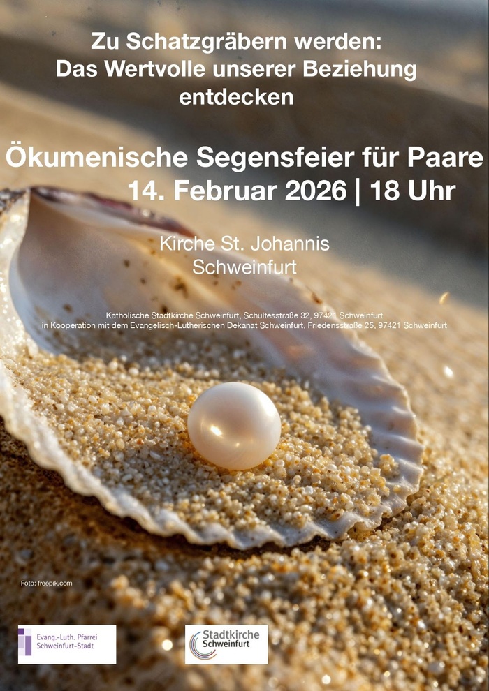Die Katholische Stadtkirche und die Evangelisch-lutherische Kirche in Schweinfurt laden alle Paare herzlich ein, sich in einem Gottesdienst für den gemeinsamen Weg segnen zu lassen. Diese Feier steht unter dem Motto: „Zu Schatzgräbern werden - Das Wertvolle unserer Beziehung entdecken“. Egal, ob frisch verliebt oder schon seit über 50 Jahren verheiratet: Am Valentinstag steht die Liebe und die Beziehung zueinander im Mittelpunkt. Kommen Sie dazu, vertiefen Sie Ihr gegenseitiges Verständnis, entdecken Sie Ihre Liebe neu – und gehen Sie gemeinsam gesegnet und gestärkt wieder hinaus.