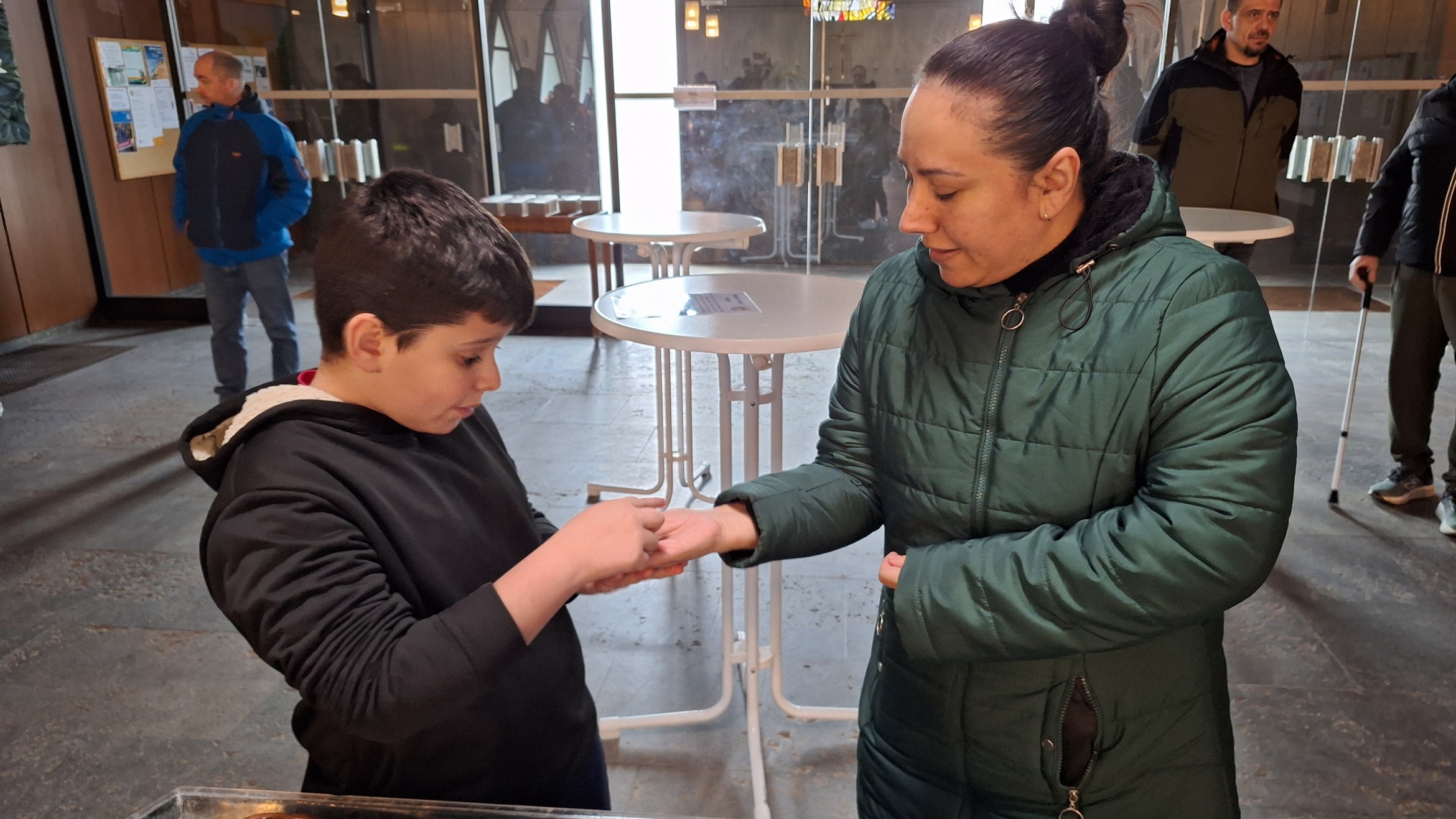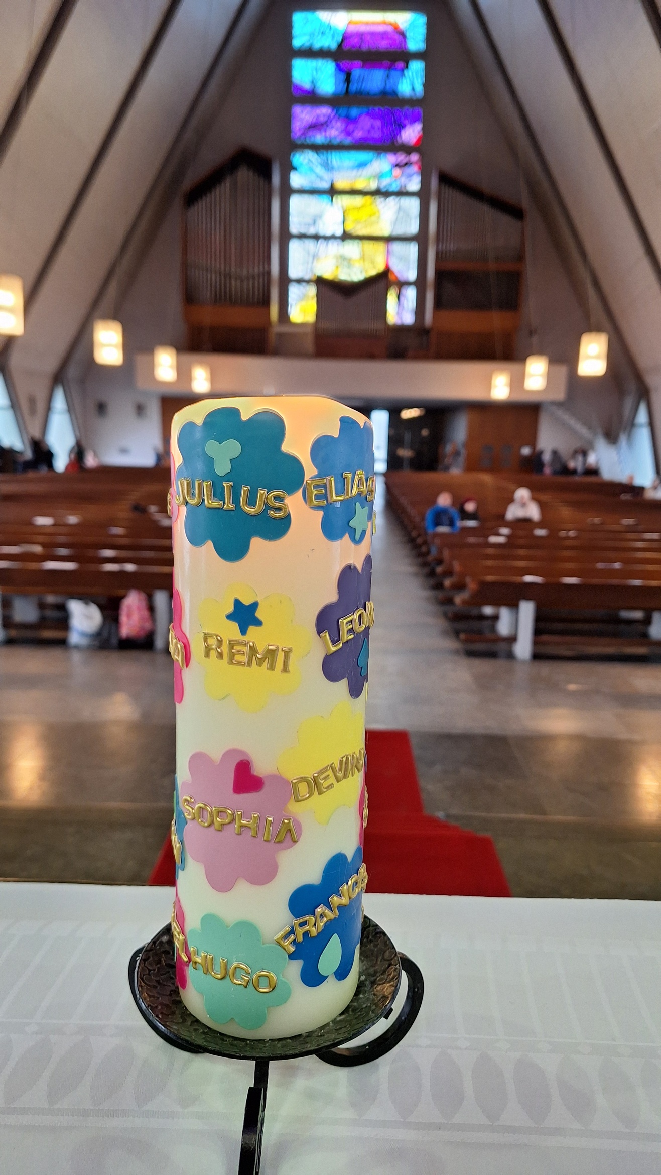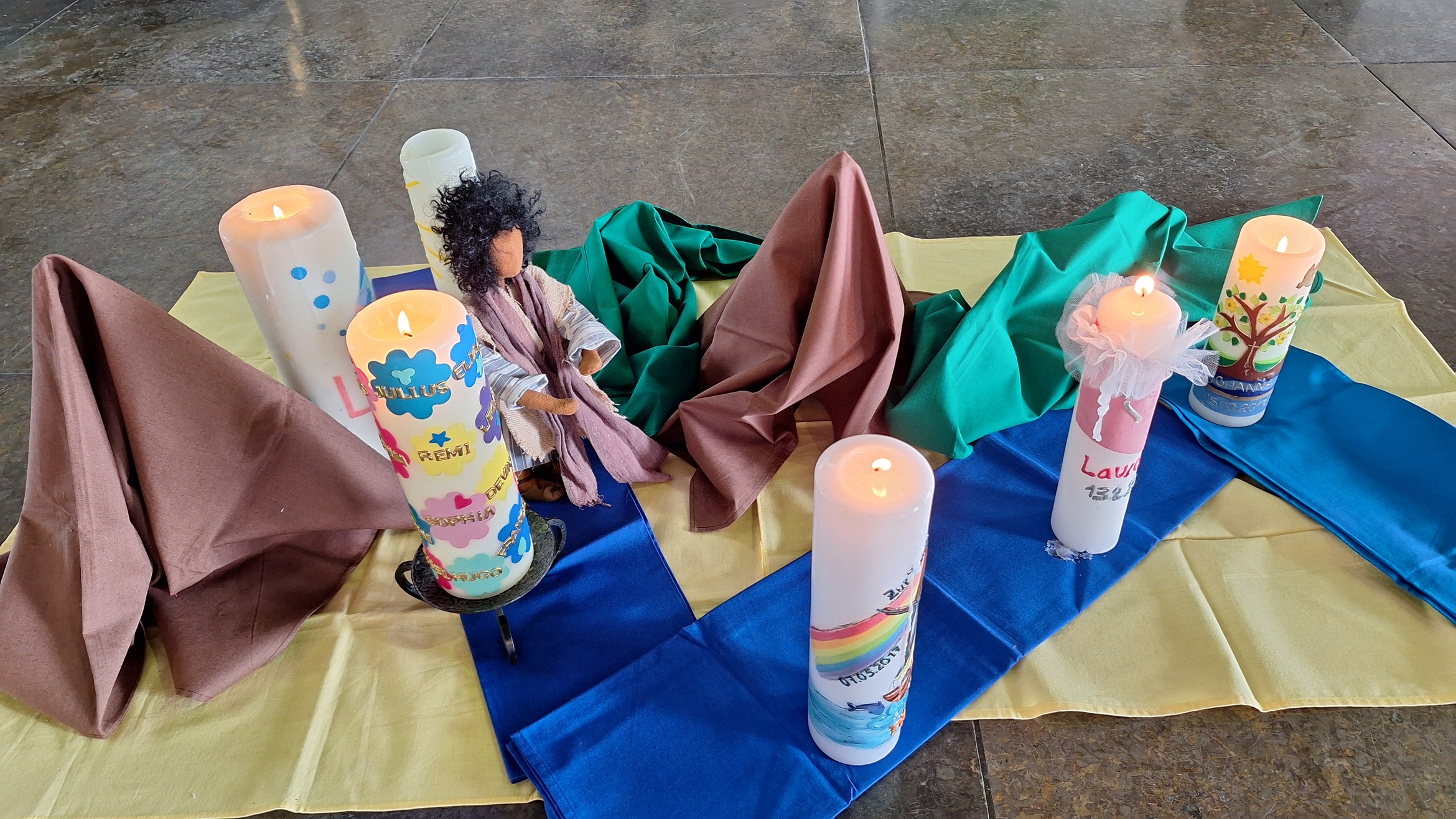 Über 80 Besucherinnen und Besucher, darunter viele (Kommunion-)familien nahmen die Einladung an, zum Familiengottesdienst aus der Reihe „Himmelssucher“ mitzufeiern. Er stand ganz im Zeichen der Taufe Jesu und dem Symbol Wasser. An acht Stationen konnten sich Eltern und Kinder ausprobieren und erkunden, wofür Wasser wichtig ist und welche Eigenschaft dieses hat. Neben Schiffchen falten und diese schwimmen lassen, Wäschestücke aufhängen, reinigen der Hände mit Wasser, dieses aus bereitgestellten Bechern bewusst trinken und anderes mehr fehlte auch eine Segensstation am Taufbrunnen nicht. Mit geweihtem Wasser konnten sich Eltern und Kinder gegenseitig ein Kreuz auf Stirn oder Hand zeichnen. Im Evangelium, das Kinder mit Tüchern und einer Egli-Figur legten, hörten die Anwesenden, wie der Evangelist Markus die Taufe Jesu durch Johannes erzählt. Der Himmel öffnet sich und Gott schaut Jesus mit Wohlwollen und Liebe an. Dieses Geschehen griff Ehe- und Familienseelsorger Ullrich Göbel in seiner Ansprache auf. Er wies darauf hin, dass ein wohlwollender Blick des Mitmenschen Aufmerksamkeit und Bestätigung erreiche, während ein abschätziger Blick das Gegenteil hervorruft. Göbel betonte außerdem, dass die sanften Augen Gottes frei von Bewertung, Leistung, Neid oder abwertenden Gedanken seien. Die Band (Raffael und Fabio di Giaio) sorgte mit kindgemäßen Liedern für Lebendigkeit und Schwung, wobei gerade die Bewegungslieder von den Anwesenden gerne aufgenommen wurden. Den Gottesdienst hatte ein Team aus Haupt- und Ehrenamtlichen aus den Gemeinden der Stadtpfarrei vorbereitet und mitgestaltet.