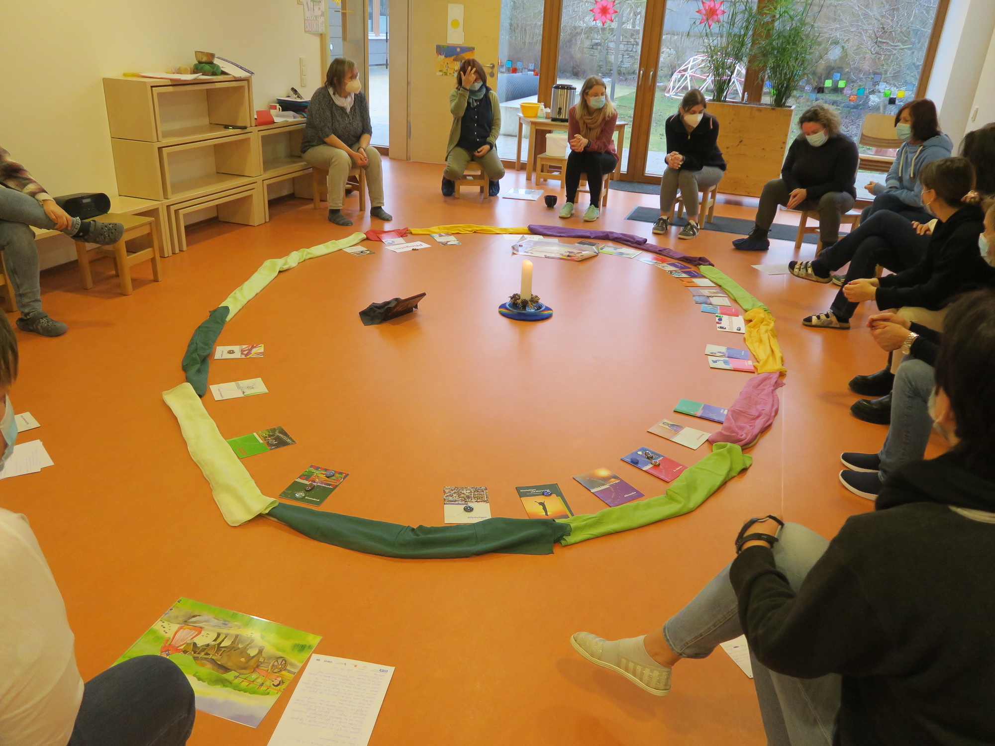 Sich mit Kindern auf die fragende Seite stellen und von dort zu philosophieren und theologisieren, hat allen viel Spaß gemacht und Handlungsspielräume eröffnet. Am Nachmittag standen praxisbezogene Übungen mit biblischen Erzählfiguren, dem Kamishibai-Erzähltheater und Storybags auf dem Programm. Anhand eines Bodenbildes zum Kirchenjahr haben die Erzieher:innen kurze Impulse für einen Morgenkreis