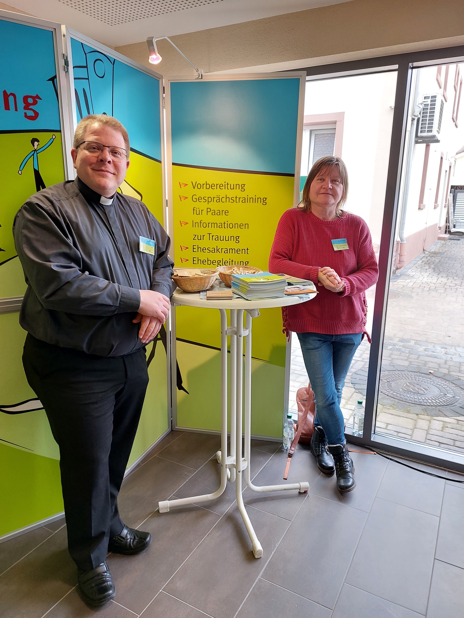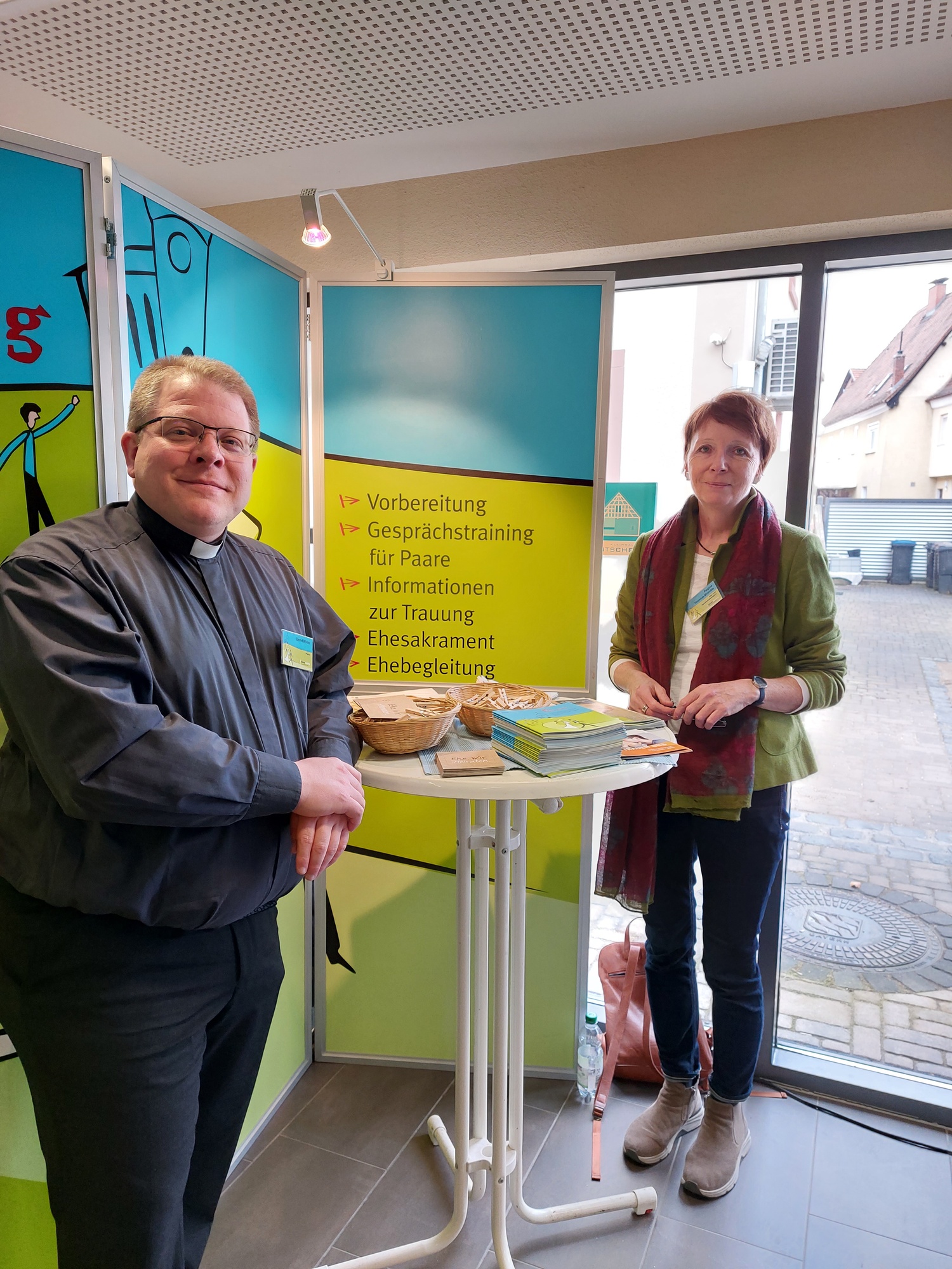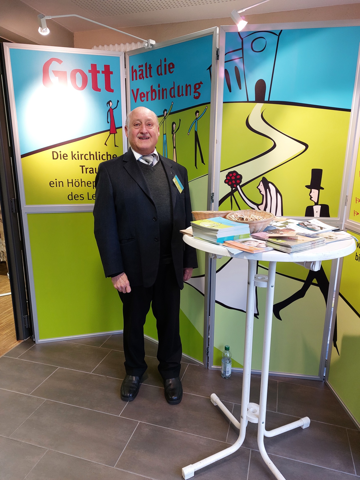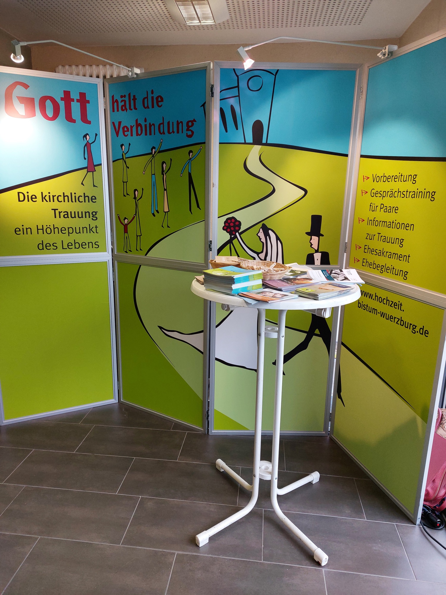 Gott hält die Verbindung – Infos und Gesprächsangebot rund um die kirchliche Trauung, Kommunikations- und Ehevorbereitungsseminare für Paare bot der Stand der Diözese Würzburg im Rahmen der Hochzeitsmesse am 12.03.2023 in der Zehntscheune Kleinwallstadt. In ökumenischer Zusammenarbeit standen Seelsorger/innen den Besucher/innen der Hochzeitsmesse für Fragen und Gespräch zur Verfügung. Reges Interesse fanden neben Infos zur kirchlichen Trauung auch die App für Paare "Ehe.Wir.Heiraten." sowie Seminarangebote für Paare.