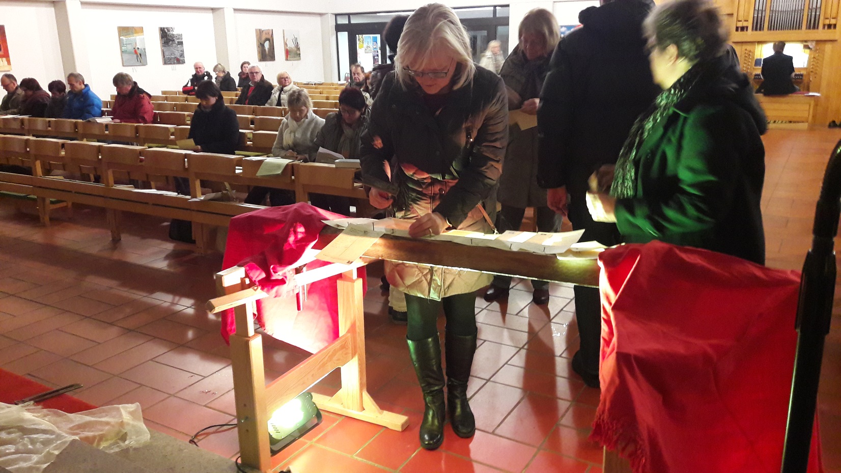 Anschließend waren alle eingeladen eigene Thesen - passend zum Reformationsgedenken 500 Jahre Thesenanschlag am 31.10.2017 in Wittenberg - zum Leiden an der Kirche zu formulieren und vor dem Altar auf einem Balken anzuschlagen. Das Team wird die Thesen an die Seelsorgekonferenz und an den Dekanatsrat des Dekanates Alzenau weitergeben. So wie Luther damals seine Thesen als Anstöße verstanden hat, werden die angeschlagenen Thesen (Das ärgert mich, darüber bin ich verletzt in meiner Kirche /Das kann ich an der Kirche leiden, darüber bin ich froh, das stärkt mich) auch als Anstöße für die Pastoral im Dekanat Alzenau verstanden.