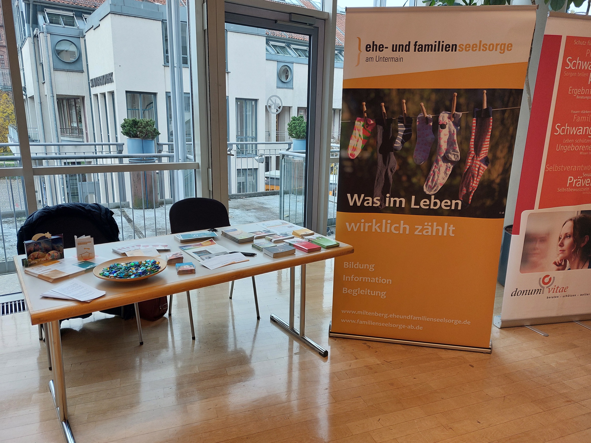 Neben persönlichem Gesprächsangebot und Infomaterial zu Veranstaltungs- und Beratungsangeboten für Familien boten Thorsten Seipel und Regina Thonius-Brendle am Stand der Ehe- und Familienseelsorge Materialien zum Mitnehmen und direkt Ausprobieren an: ein Abendritual zum Danke-sagen in der Familie und die Bastelanleitung für ein Hosentaschen-Krippenbuch für die Weihnachtszeit.